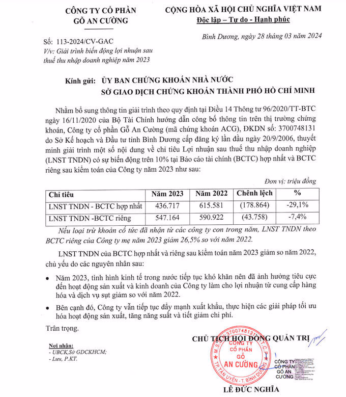 Lý giải nguyên nhân lợi nhuận sau thuế có sự chêch lệch so với năm 2022, Công ty Gỗ An Cường cho rằng, do năm 2023, tình hình kinh tế trong nước tiếp tục khó khăn nên đã ảnh hưởng tiêu cực đến hoạt động sản xuất và kinh doanh của Công ty làm cho lợi nhuận từ cung cấp hàng hóa và dịch vụ sụt giảm so với năm 2022. Theo đó, Công ty vẫn tiếp tục đẩy mạnh xuất khẩu, thực hiện các giải pháp tối ưu hóa hoạt động sản xuất, tăng năng suất và tiết giảm chi phí.