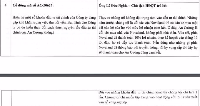 Trả lời vấn đề này ông Lê Đức Nghĩa – Chủ tịch HĐQT Công ty Cổ phần Gỗ An Cường cho rằng, không đặt trọng tâm vào đầu tư tài chính. Những năm trước, Công ty Gỗ An Cường là đối tác của Novaland thì có đầu tư mua một vài căn hộ của họ với mức lợi nhuận cam kết. Ở đây, An Cường là đối tác mua nhà của Novaland, không phải nhà thầu. Vừa rồi, phía Novaland đã thanh toán 10% lợi nhuận, theo kế hoạch vào tháng 10 tới đây, họ sẽ tiếp tục thanh toán. Nếu đúng như những gì phía Novaland đã thông báo với truyền thông, tôi hy vọng sắp tới đây họ sẽ thanh toán cho An Cường đúng cam kết.