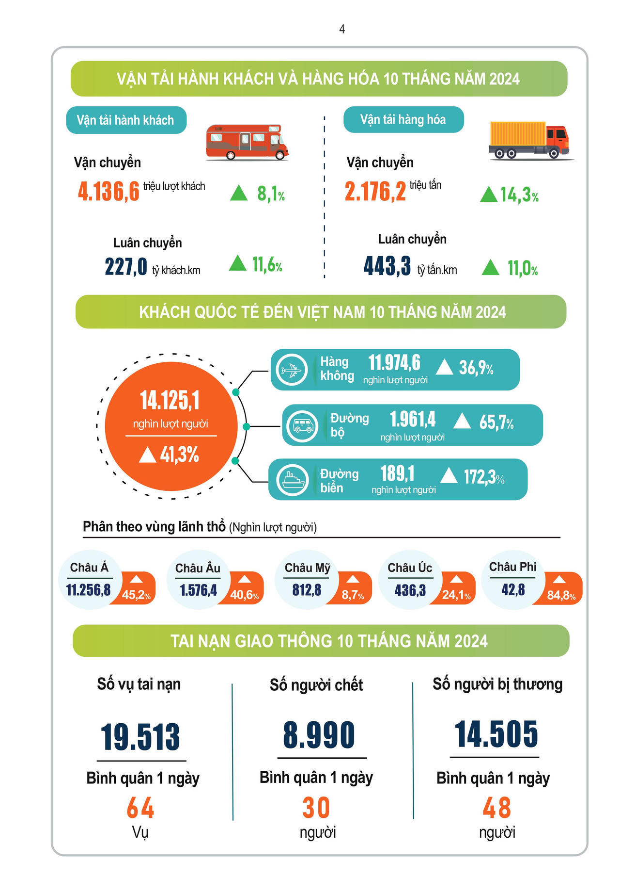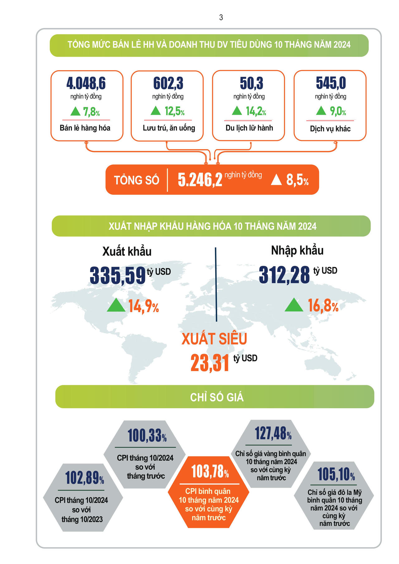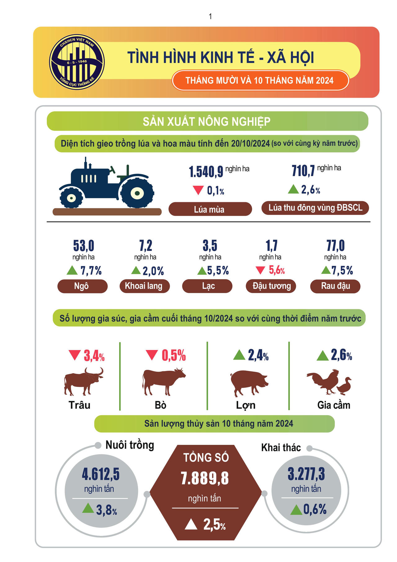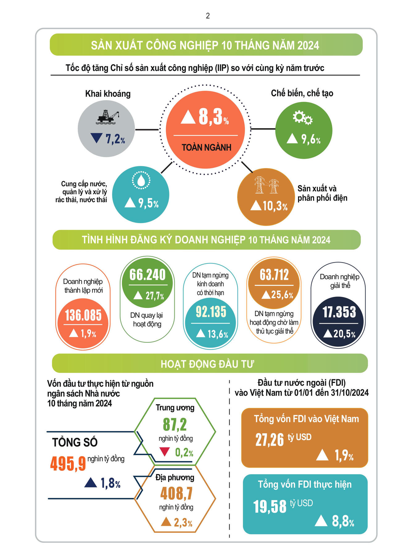 Theo Tổng cục Thống kê, tình hình kinh tế - xã hội 10 tháng tiếp tục có những dấu hiệu tích cực khi chỉ số sản xuất toàn ngành công nghiệp ước tăng 8,3% so với cùng kỳ năm trước; gần 14,2 nghìn doanh nghiệp thành lập mới; thu ngân sách nhà nước đạt 1.654,2 nghìn tỷ đồng, bằng 97,2% dự toán năm...