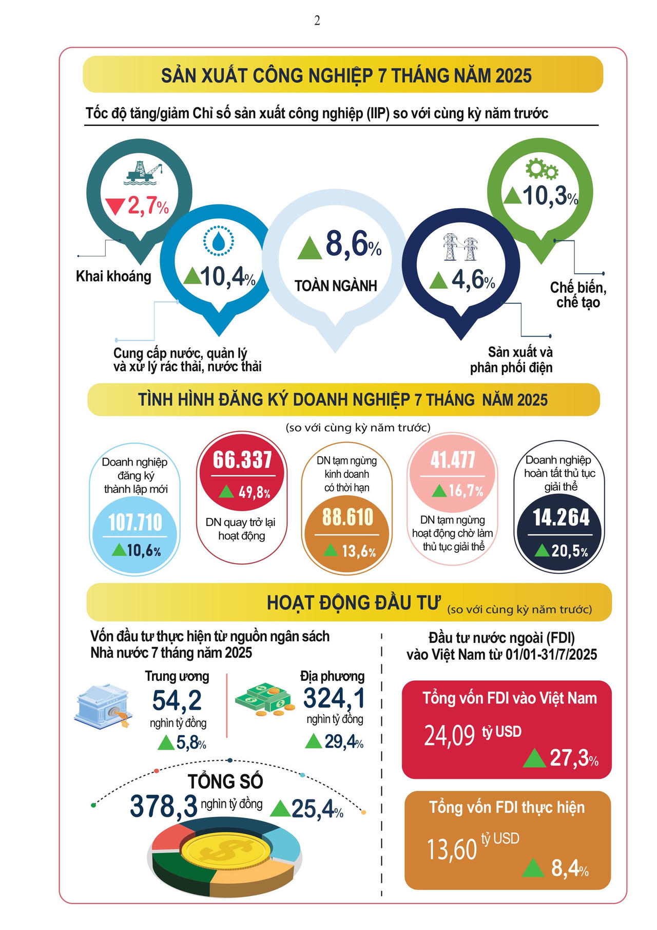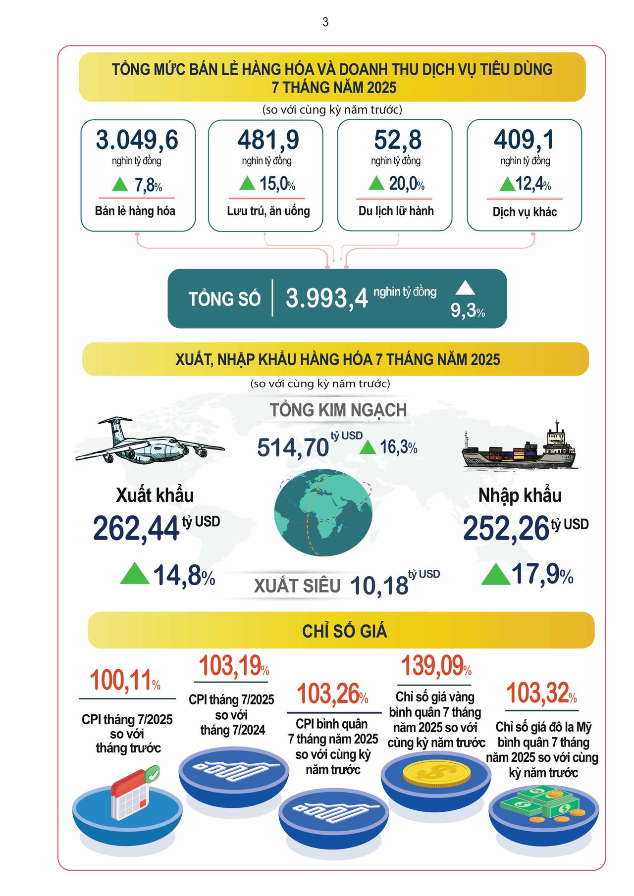 7 tháng đầu năm 2025, kinh tế - xã hội tiếp tục phục hồi tích cực với tăng trưởng ổn định, sản xuất công nghiệp, xuất nhập khẩu duy trì đà tăng; giải ngân đầu tư công cải thiện;
