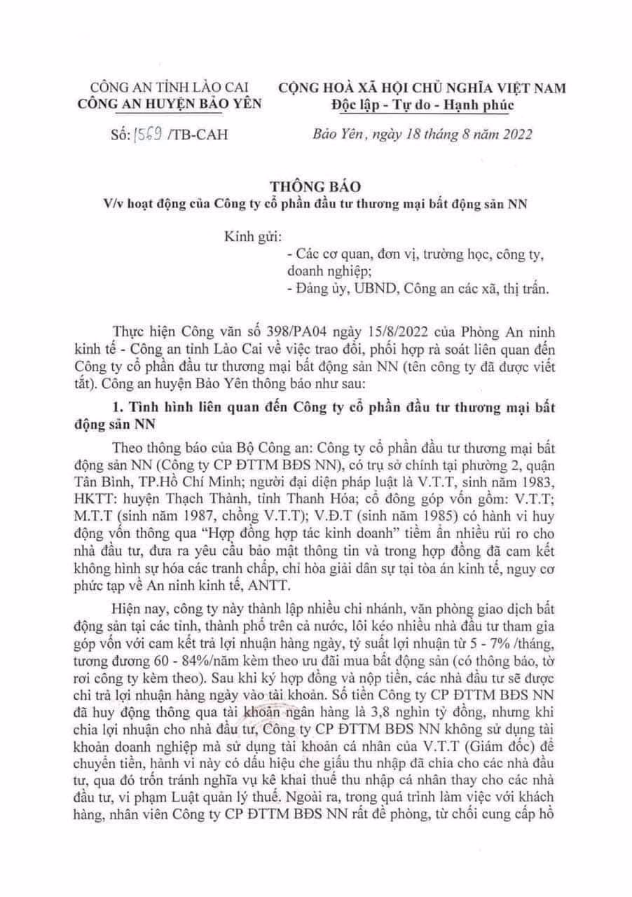 Xét đề nghị của Công an tỉnh tại Tờ trình số 221, ngày 22/8/2022, Chủ tịch UBND tỉnh có ý kiến như sau: Căn cứ thông báo của Cục ANKT, Bộ Công an tại Công văn số 518/ĐK, ngày 4/8/2022 có nêu: Công ty Nhật Nam, trụ sở chính tại 54 Ngô Thị Thu Minh, phường 2, quận Tân Bình, TP Hồ Chí Minh; người đại diện theo pháp luật là Vũ Thị Thúy (hộ khẩu thường trú khu 4, xã Thạch Tân, huyện Thạch Thành, tỉnh Thanh Hóa), cổ đông góp vốn gồm: Vũ Thị Thúy, Mai Thanh Tùng (chồng Vũ Thị Thúy), Vũ Đức Tại có hành vi huy động vốn thông qua "Hợp đồng hợp tác kinh doanh” tiềm ẩn nhiều rủi ro cho nhà đầu tư (NĐT), đưa ra yêu cầu bảo mật thông tin và cam kết không hình sự hóa các tranh chấp, chỉ hòa giải dân sự tại tòa án kinh tế, nguy cơ phức tạp về ANKT, ANTT. Hiện nay, công ty này thành lập nhiều chi nhánh và các văn phòng giao dịch bất động sản tại các tỉnh, thành phố trên cả nước, lôi kéo nhiều NĐT tham gia góp vốn với cam kết trả lợi nhuận hàng ngày với tỷ suất lợi nhuận cao (từ 5 - 7%/tháng, tương đương 60 - 84%/năm, kèm theo nhiều ưu đãi BĐS).
