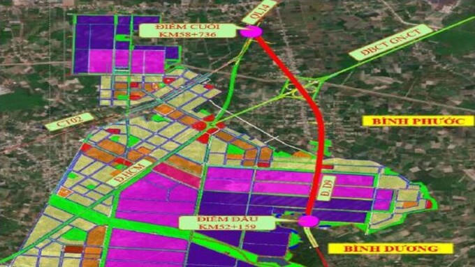 Dự án đi qua tỉnh Bình Phước có điểm đầu tại ranh giới tỉnh Bình Phước, tuyến đi trùng vào tim đường D9, Dự án KCN và Dân cư Becamex - Bình Phước khoảng 2km; tuyến đi tiếp khoảng 1,5km theo quy hoạch chung đô thị TX. Chơn Thành, sau đó kéo dài và kết nối với Quốc lộ 14 tại Km993+500.