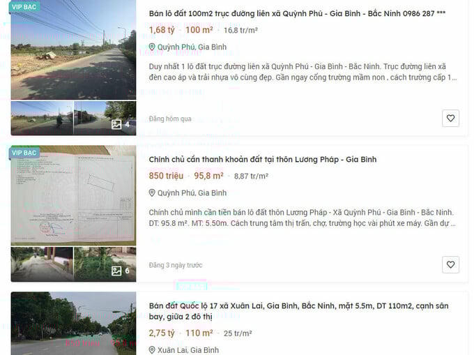 Giá đất tại huyện Gia Bình trên trang batdongsan.com