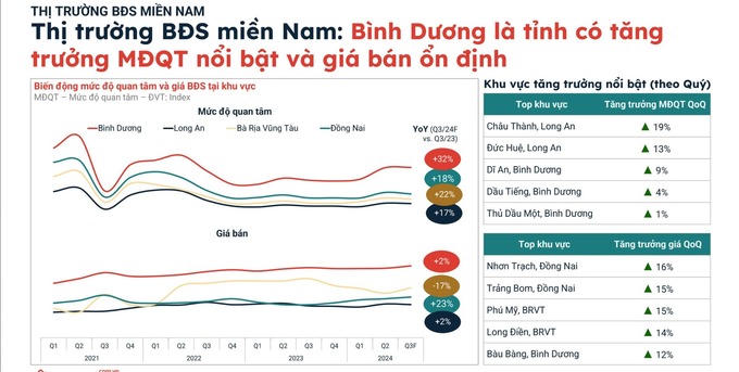Theo Batdongsan.com.vn, Bình Dương đang ghi nhận mức tăng trưởng nổi bật về mức độ quan tâm bất động sản và giá bán ổn định nhất tại khu vực phía Nam. Cụ thể, trong quý III/2024, mức độ quan tâm bất động sản tại Bình Dương tăng 32% so với cùng kỳ năm trước, cao hơn nhiều so với các địa phương khác như Long An, Bà Rịa - Vũng Tàu, và Đồng Nai, với mức tăng từ 17% đến 22%.