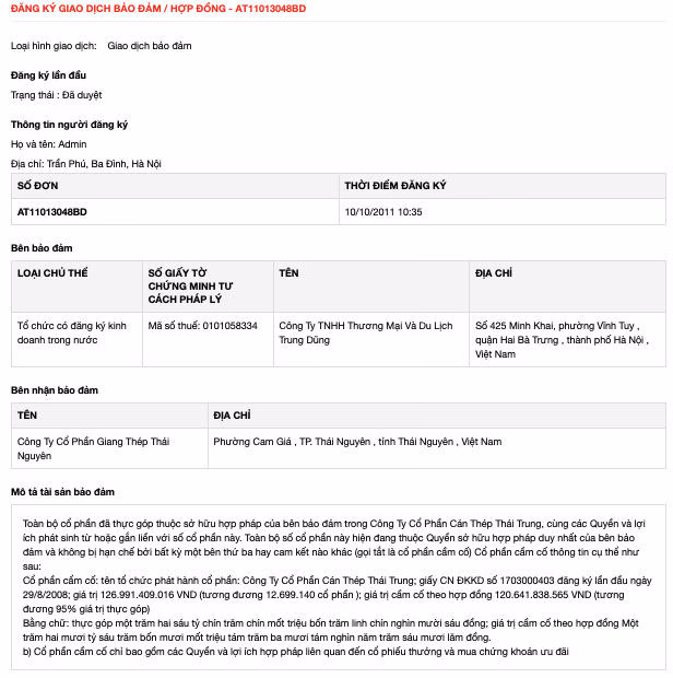 Tisco không nói rõ khoản nợ với Công ty DL Trung Dũng. Tuy vậy thông tin giao dịch đăng ký đảm bảo có ghi nhận một hợp đồng đăng ký đảm bảo giữa công ty Trung Dũng và Gang thép Thái Nguyên ký tháng 10/2011. Hợp đồng ghi rõ tài sản đảm bảo là “Toàn bộ cổ phần đã thực góp thuộc sở hữu hợp pháp của của Công ty Trung Dũng trong Công Ty Cổ Phần Cán Thép Thái Trung, cùng các Quyền và lợi ích phát sinh từ hoặc gắn liền với số cổ phần này. Cổ phần cầm cốtại Công Ty Cổ Phần Cán Thép Thái Trung có giá trị 126.991.409.016 VND (tương đương 12.699.140 cổ phần ); giá trị cầm cố theo hợp đồng là 95% giá trị thực góp, tương ứng 120.641.838.565 VND. Cổ phần cầm cố chỉ bao gồm các Quyền và lợi ích hợp pháp liên quan đến cổ phiếu thưởng và mua chứng khoán ưu đãi”.