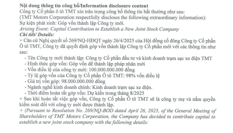 Theo đó, Công ty cổ phần Đầu tư và kinh doanh trạm sạc TMT có vốn điều lệ là 100 tỷ đồng, trong đó tỷ lệ góp của TMT Motors là 98 tỷ đồng (chiếm tỷ lệ 98%). Thời gian hoàn tất góp vốn dự kiến trong tháng 8/2025.
