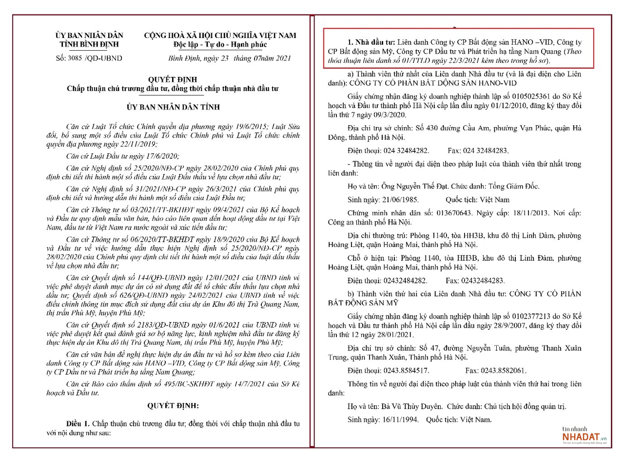 Liên danh trên có địa chỉ tại số 430 Cầu Am, phường Vạn Phúc, quận Hà Đông, Hà Nội. Đại diện của liên danh là HANO – VID. Theo quy định, để thực hiện dự án, vốn góp liên danh phải thu xếp là 220 tỷ đồng, chiếm 15% tổng vốn đầu tư. Trong đó, HANO – VID và Công ty Bất động sản Mỹ góp 77 tỷ đồng, còn Công ty Nam Quang góp 66 tỷ đồng.