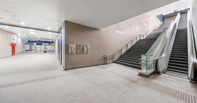 Lối vào ga Metro Ba Son tại tầng B1 - khu vực phục vụ hành khách của Marina Central Tower đã gần như hoàn thiện, sẵn sàng chờ ngày tuyến Metro số 1 chính thức đi vào khai thác thương mại vào cuối năm nay.