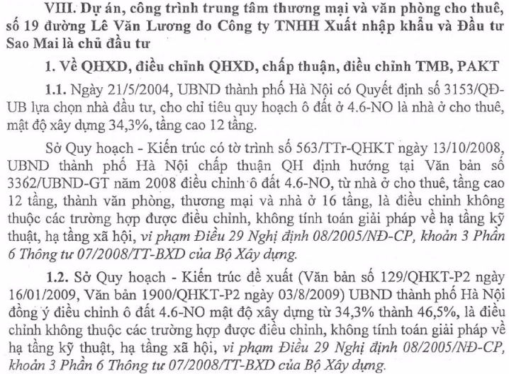Tại dự án số 19 đường Lê Văn Lương do Công ty TNHH Xuất nhập khẩu và Đầu tư Sao Mai làm chủ đầu tư, Thanh tra Bộ Xây dựng đã chỉ rõ, UBND TP Hà Nội đã 2 lần điều chỉnh sai quy định pháp luật. Cụ thể, lần thứ 1 , vào ngày 13/10/2008, UBND TP Hà Nội đã chấp thuận QH địch hướng tại văn bản số 3362/UBND-GT năm 2008 tại tờ trình dố 563/TTr-QHKT do Sở Quy hoạch – Kiến trúc đệ trình, quyết định điều chỉnh ô đất 4.6-NO, từ nhà ở cho thuê, tầng cao 12 tầng thành văn phòng, thương mại và nhà ở 16 tầng, là điều chỉnh không thuộc các trường hợp được điều chỉnh, không tính toán giải pháp về hạ tầng kỹ thuật, hạ tầng xã hội, vi phạm Điều 29 Nghị định 08/2005/NĐ-CP, khoản 3 Phấn 6 Thông tư 07/2008/TT-BXD của Bộ Xây dựng.