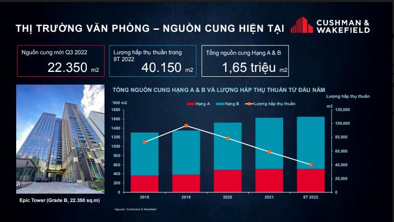 Giá thuê văn phòng toàn thị trường cũng có xu hướng tăng nhẹ với 34 USD/m2/tháng đối với Hạng A, và 20 USD/m2/tháng đối với Hạng B. Thị trường chứng kiến khả năng hấp thụ tích cực với lượng hấp thụ thuần trong 9 tháng 2022 là 40.000 m2, đến từ các công ty trong lĩnh vực bảo hiểm (25%), sản xuất và chế tạo (25%), công nghệ (20%), dịch vụ (10%) và logistics (5%), chủ yếu tập trung ở các tòa nhà rìa trung tâm và khu Tây.