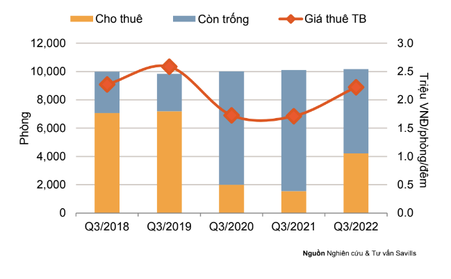 Ở phân khúc khách sạn, Savills cho biết, nguồn cung đạt 10.179 phòng từ 17 khách sạn 5 sao, 17 khách sạn 4 sao và 31 khách sạn 3 sao, tăng 2% theo quý và 1% theo năm sau khi Eastin Hotel & Residences được xếp hạng 4 sao. Khách sạn này mở cửa từ Q1/2022 với 196 phòng. Nhìn chung, công suất giảm -1 điểm % theo quý nhưng tăng 25 điểm % theo năm, đạt 42%. Giá thuê phòng trung bình đạt 2,2 triệu VNĐ, tăng 10% theo quý và 30% theo năm.