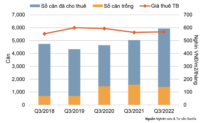 Theo đó, nguồn cung mới gồm 5.935 căn từ 63 dự án tăng 4% theo quý và 18% theo năm. Fraser Residence (Hạng A) tại quận Bắc Từ Liêm ra mắt với 216 phòng. Sau sự phục hồi mạnh mẽ trong Q2/2022, tình hình hoạt động ổn định trong quý này. Công suất 77% tăng 1 điểm % theo quý và 8 điểm % theo năm; tuy nhiên vẫn thấp hơn mức 91% trong Q3/2019. Giá thuê đạt 568.000 VNĐ/m2/tháng tăng 1% theo quý và ổn định theo năm. Quận Nam Từ Liêm có giá thuê cao nhất đạt 659.000 VNĐ/m2/tháng.