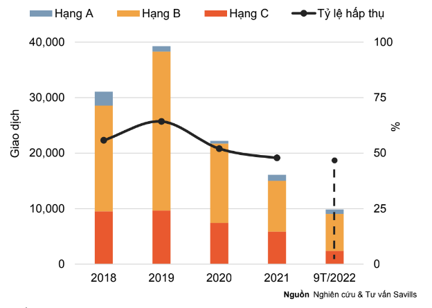 Việc siết chặt tín dụng vẫn tiếp tục khiến tỷ lệ hấp thụ trong quý này giảm -5 điểm % theo quý xuống còn 25%. Tuy nhiên, nguồn cung mới trong quý 3 đã được hấp thụ tốt, chiếm 75% số lượng giao dịch của thị trường.