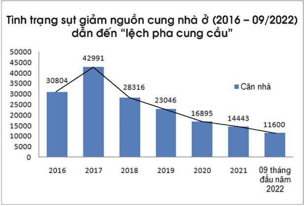 Cụ thể, so với năm 2017, năm 2018 nguồn cung chỉ có 28.316 căn nhà (chỉ bằng 65,8 %); Năm 2019 nguồn cung chỉ có 23.046 căn nhà (chỉ bằng 53,6 %); Năm 2020 nguồn cung chỉ có 16.895 căn nhà (chỉ bằng 39,2 %); Năm 2021 nguồn cung chỉ có 14.443 căn nhà (chỉ bằng 33,6 %).