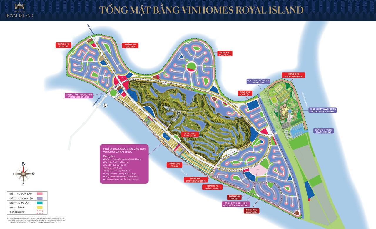 Dự án Vinhomes Royal Island được chủ đầu tư định vị ở phân khúc cao cấp, với 11 phân khu gồm các loại hình nhà ở như biệt thự, liền kề, shophouse bao quanh sân golf.