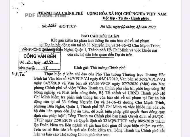 Thanh tra Chính phủ vừa có kết luận số 2099/BC-TTCP ngày 2/12/2020 gửi Thủ tướng để báo cáo kết quả kiểm tra thông tin báo chí phản ánh về sai phạm tại dự án bất động sản số 33 Nguyễn Du và số 34-36-42 Chu Mạnh Trinh và việc khiếu nại của các hộ dân liên quan đến dự án.