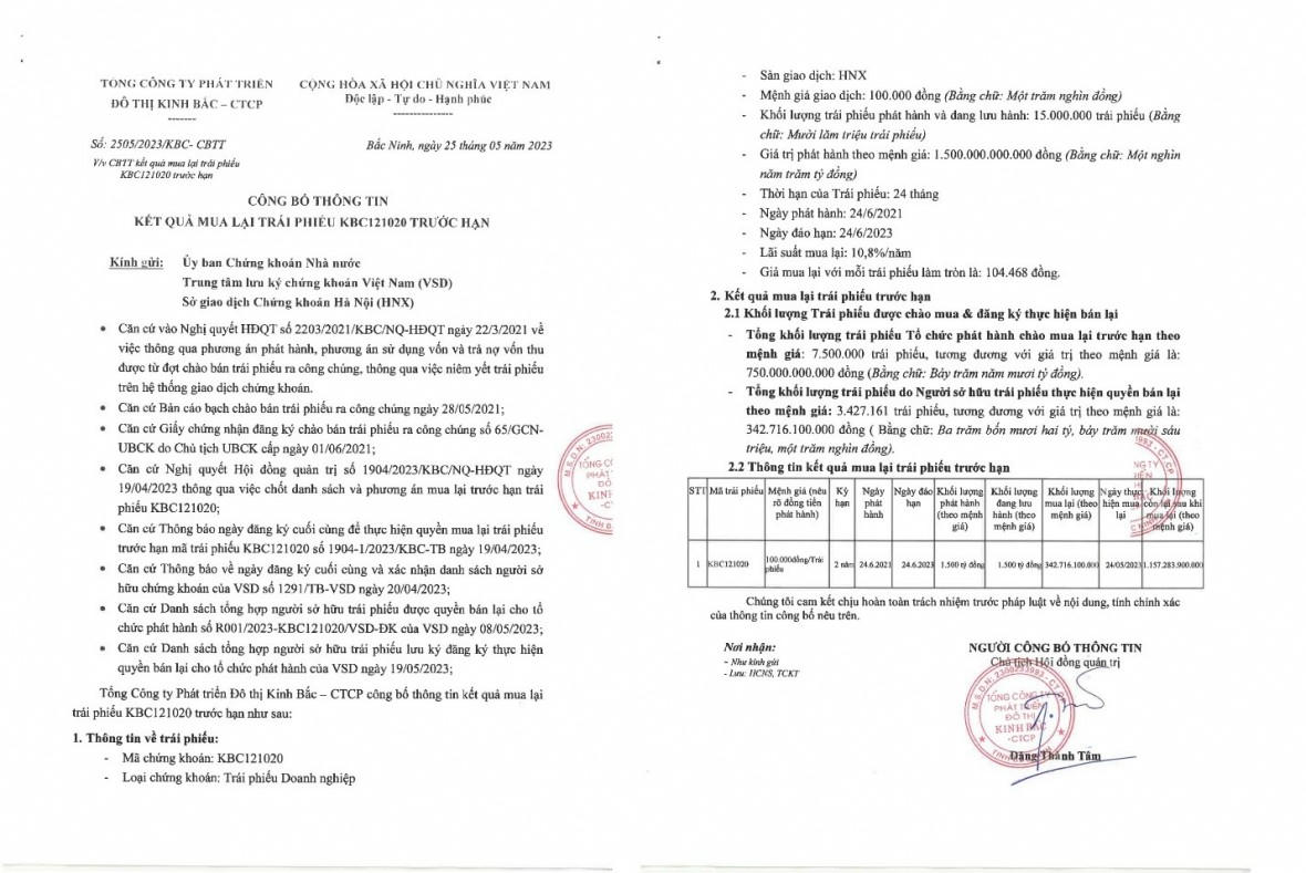 Kinh Bắc đã trả nợ đúng hạn trái phiếu KBCH2123001 đáo hạn ngày 22/2/2023, tổng trị giá 400 tỷ đồng; và mua lại trước hạn toàn bộ trái phiếu KBCH2123002 đáo hạn ngày 3/6/2023, tổng trị giá 1.000 tỷ đồng, hoàn tất thanh toán vào ngày 5/4/2023.