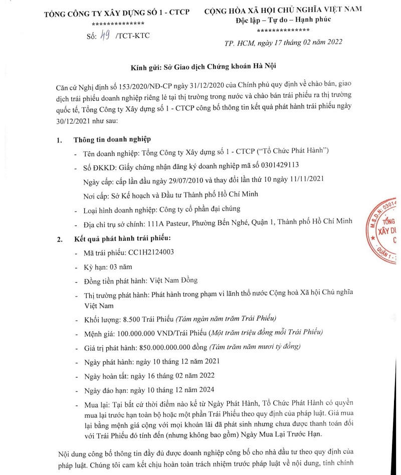 Trước đó, vào tháng 10 và tháng 12/2021 CC1 cũng đã trải qua 2 đợt phát hành với giá trị của từng đợt lần lượt là 1.000 tỷ và 800 tỷ đồng. Đợt phát hành vào tháng 10, số tiền thu về công ty đầu tư xây dựng hai dự án chung cư lô số 2 – giai đoạn 1 tại Khu dân cư Hạnh Phúc (600 tỷ đồng) và dự án điện gió Hàm Kiệm 2 (400 tỷ đồng).