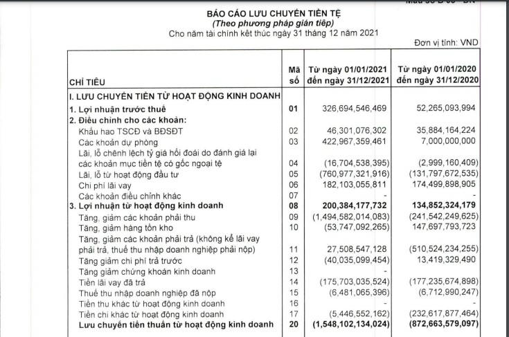 Đáng chú ý, lợi nhuận từ hoạt động kinh doanh của CC1 năm vừa qua ghi nhận đạt hơn 200 tỷ đồng (tăng 33% so với năm 2020). Tuy nhiên, kết thúc năm, dòng tiền thuần từ hoạt động kinh doanh của CC1 lại âm 1.548 tỷ đồng.