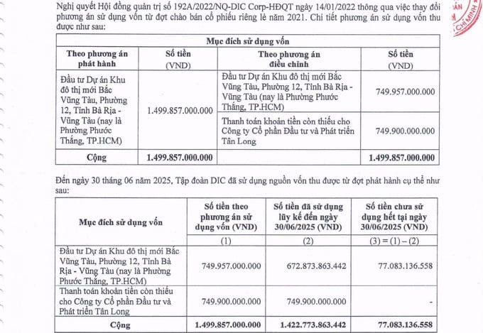 Báo cáo tài chính của DIG tại ngày 30/6/2025 cho thấy đã giải ngân toàn bộ gần 750 tỷ đồng để thanh toán khoản tiền còn thiếu cho Công ty Cổ phần Đầu tư và Phát triển Tân Long và giải ngân hơn 672,8 tỷ đồng vào dự án Khu đô thị mới Bắc Vũng Tàu, số còn lại chưa giải ngân hơn 77 tỷ đồng.