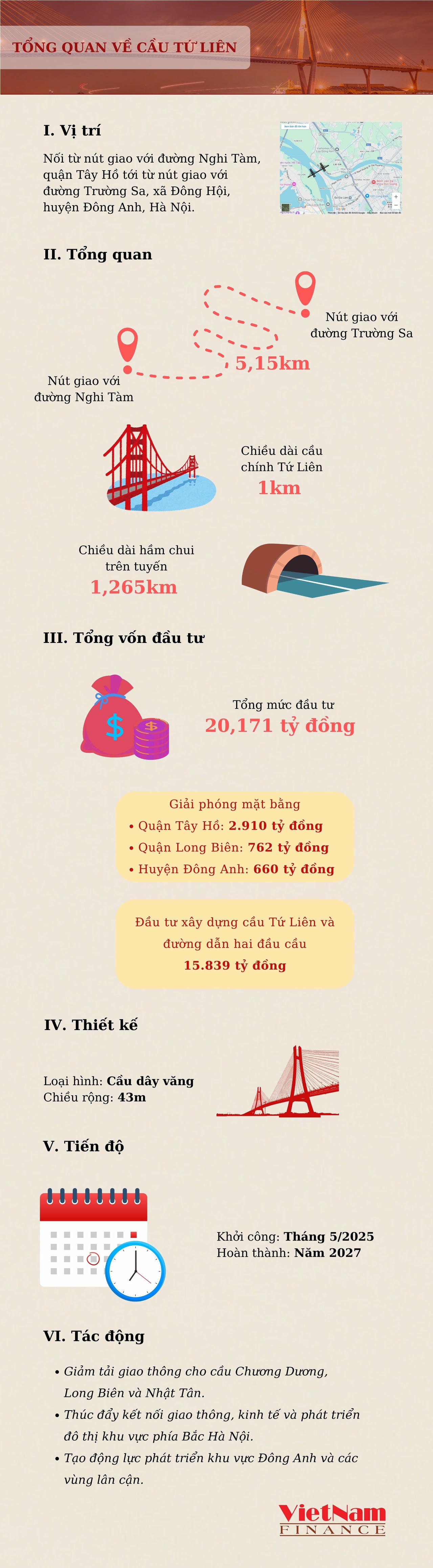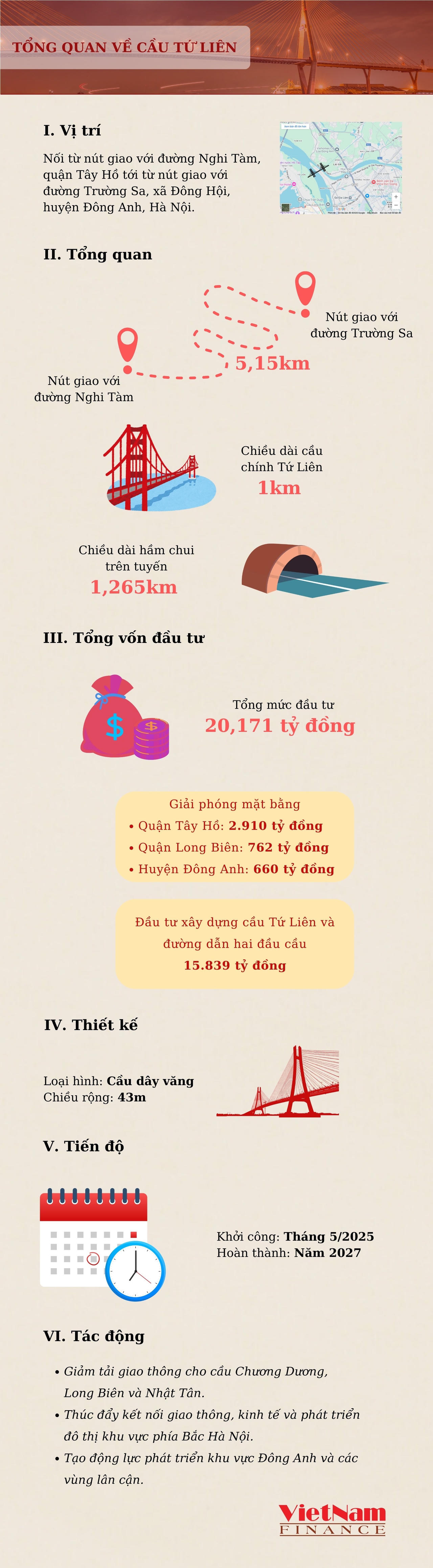 Dự án đầu tư xây dựng cầu Tứ Liên và đường 2 đầu cầu từ nút giao với đường Nghi Tàm đến nút giao với đường Trường Sa với tổng chiều dài khoảng 5,15km, tổng mức đầu tư dự án 20.171 tỷ đồng.