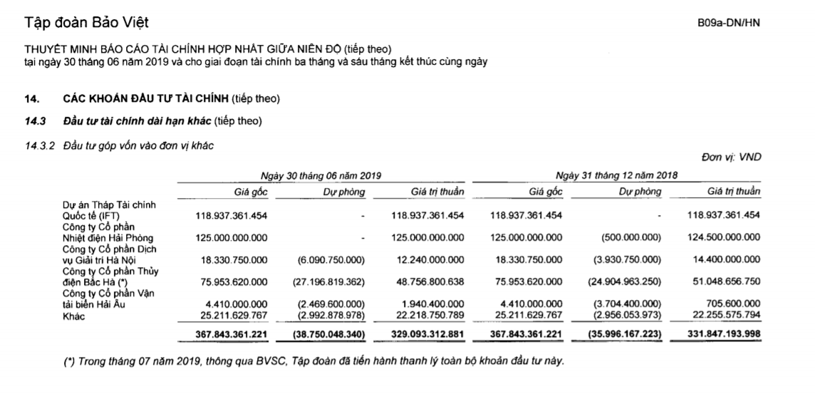 Cũng liên quan đến bất động sản, tại thời điểm 30/6, Tập đoàn Bảo Việt ghi nhận gần 119 tỷ đồng đầu tư vào dự án Tháp Tài chính Quốc tế (IFT).