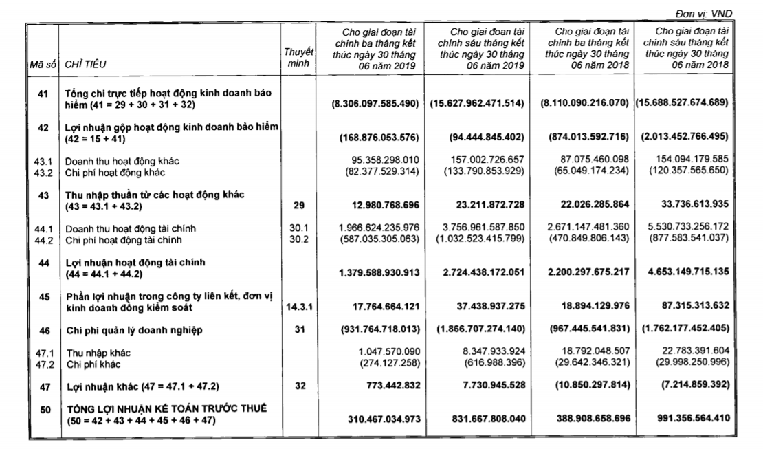 Tuy nhiên, tổng chi trực tiếp hoạt động kinh doanh bảo hiểm đạt 15.726 tỷ đồng, tương đương với cùng kỳ năm ngoái khiến cho lãi gộp của Tập đoàn trong hoạt động kinh doanh bảo hiểm dù cải thiện hơn so với mức âm 2.013 tỷ của cùng kỳ năm ngoái song vẫn lỗ hơn 94 tỷ đồng trong 6 tháng đầu năm nay.