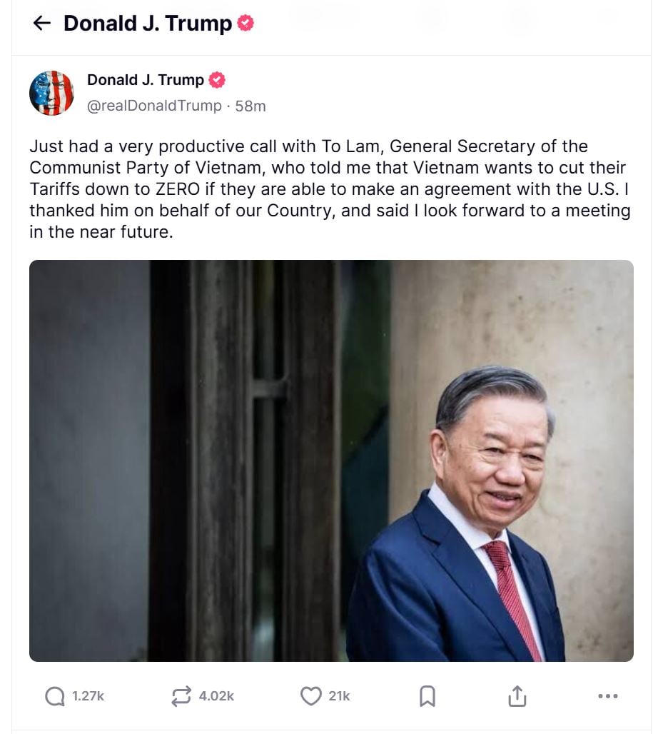 Ngay sau cuộc điện đàm, Tổng thống Mỹ Donald Trump đã chia sẻ trên mạng xã hội Truth Social của ông rằng: “Tôi vừa có cuộc điện đàm rất hiệu quả với Tổng Bí thư Đảng Cộng sản Việt Nam Tô Lâm. Ông ấy nói với tôi rằng Việt Nam muốn cắt giảm thuế quan xuống mức 0 nếu họ có thể đạt được thỏa thuận với Mỹ. Tôi đã thay mặt đất nước cảm ơn ông ấy và nói rằng tôi mong muốn có một cuộc gặp trong tương lai gần”.