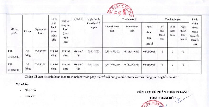 Với kỳ trả lãi 6 tháng/ lần, doanh nghiệp này đã có 2 lần trong năm 2023 thanh toán gốc và lãi trái phiếu. Trong đó, kỳ trả đầu tiên rơi vào tháng 5/2024 với 6.518.479.452 đồng; và lần tiếp theo rơi vào tháng 11/2024 với số tiền là 6.747.002.739 đồng.