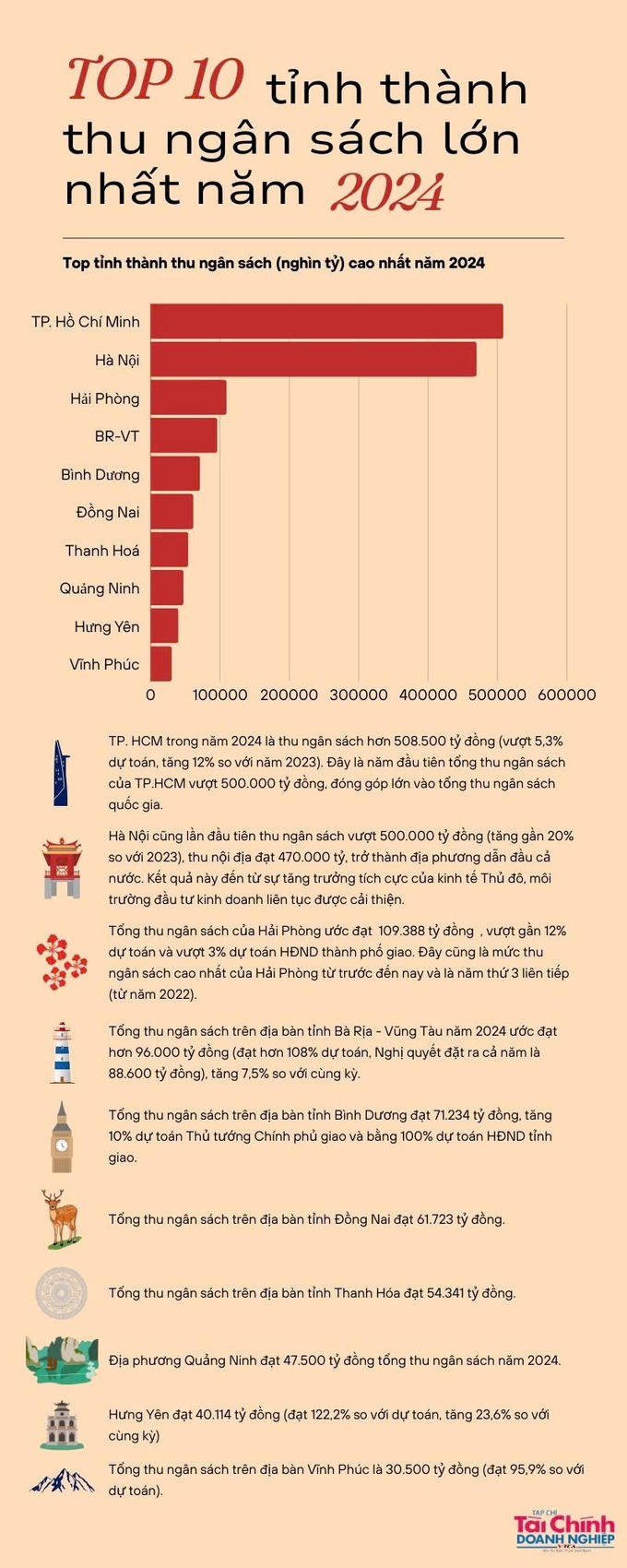 Top 10 địa phương thu ngân sách lớn nhất cả nước năm 2024