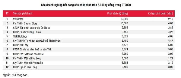 Theo SSI Reseach, lượng trái phiếu do các doanh nghiệp bất động sản phát hành tính riêng trong quý 3/2020 là gần 63 nghìn tỷ đồng, tập trung vào tháng 7 và 8/2020, tương đương 44% tổng TPDN mà các doanh nghiệp BĐS phát hành trong 9 tháng đầu năm 2020.