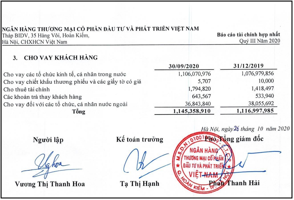 Kết thúc quý III/2020 BIDV là ngân hàng có số dư cho vay khách hàng lớn nhất với 1,15 triệu tỷ đồng, tăng 2,5% so với cuối năm 2019