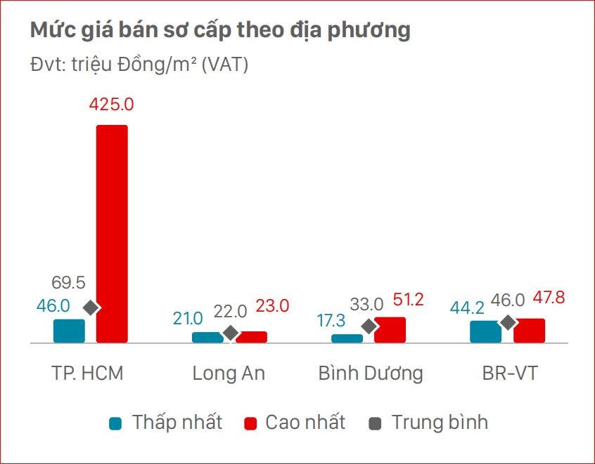 Đáng chú ý, trong quý 3/2022 này, thị trường TP.HCM ghi nhận dự án căn hộ hạng sang có giá bán “trên trời” 425 triệu đồng/m2. Trong khi đó, căn hộ có giá bán thấp nhất cũng chạm mốc 46 triệu đồng/m2.