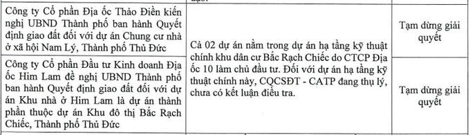 Đáng chú ý, trong số 7 kiến nghị mà Sở Tài Nguyên và Môi trường ra quyết định tạm dừng giải quyết thì có 2 dự án nằm trong dự án hạ tầng kỹ thuật chính của khu dân cư Bắc Rạch Chiếc do CTCP Địa ốc 10 làm chủ đầu tư. Dự án này cơ quan cảnh sát điều tra đang thụ lý và chưa có kết quả điều tra nên Sở phải tạm dừng giải quyết kiến nghị.