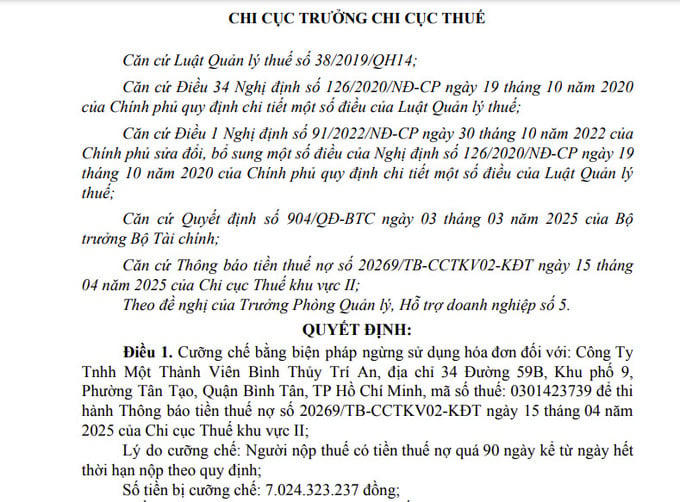 Theo Quyết định số 35949/QĐ-CCTKV02-KĐT do ông Nguyễn Nam Bình – Chi cục trưởng Chi cục Thuế khu vực II, ký ngày 23/5/2025, Công ty TNHH MTV Bình Thủy Trí An (Bình Thủy Trí An) đã bị cưỡng chế bằng biện pháp ngừng sử dụng hóa đơn, dựa trên Thông báo tiền thuế nợ số 20269/TB-CCTKV02-KĐT ngày 15/4/2025 của Chi cục Thuế khu vực II.
