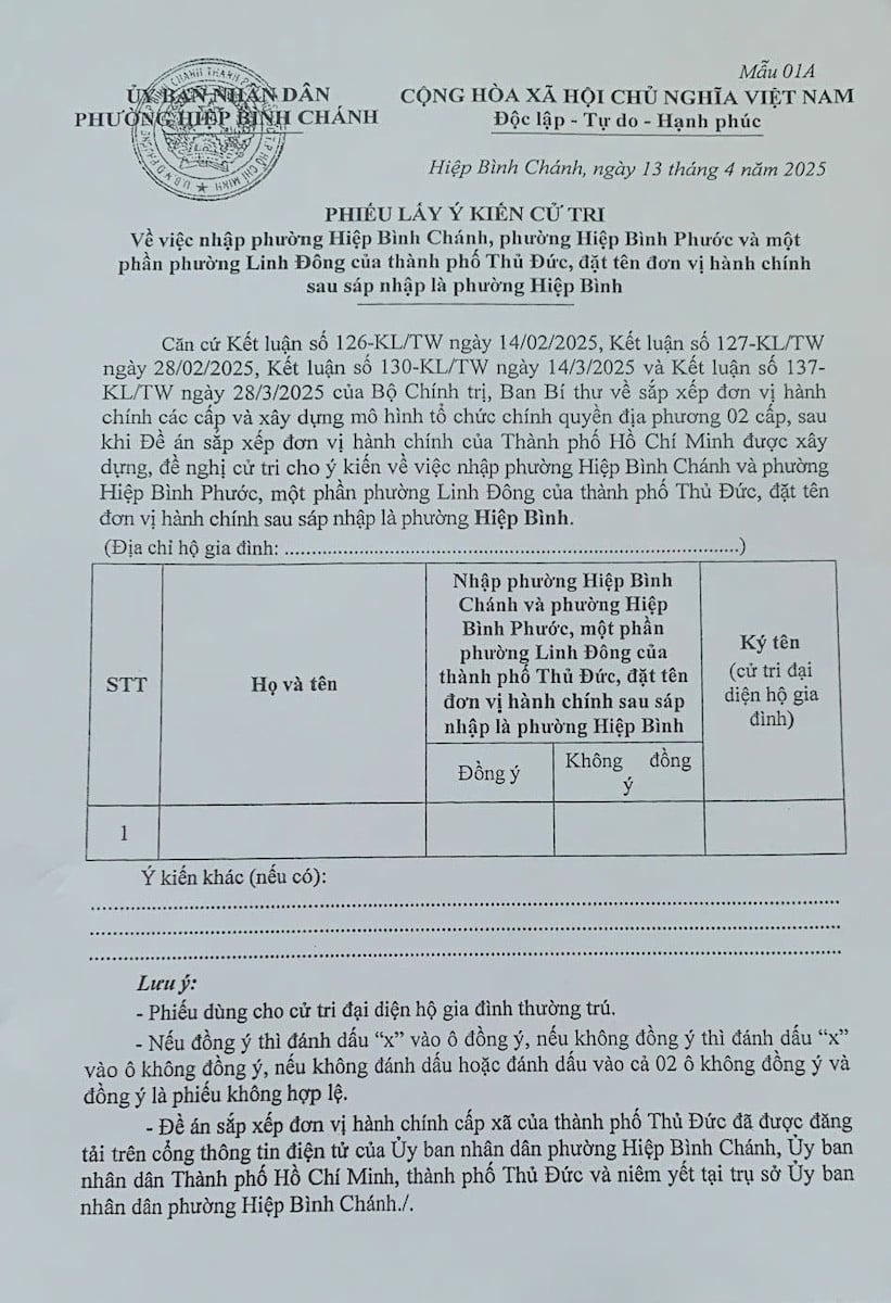 Tại phường An Phú, người dân được phát hai phiếu khảo sát, một về phương án nhập TP. HCM, Bình Dương và Bà Rịa – Vũng Tàu; phiếu còn lại về việc sáp nhập các phường An Phú, Bình Trưng Đông và Bình Trưng Tây thành phường Bình Trưng (mới). Trong khi đó, tại phường Hiệp Bình Chánh, người dân cũng được lấy ý kiến về phương án nhập các phường Hiệp Bình Chánh, Hiệp Bình Phước và một phần phường Linh Đông thành phường Hiệp Bình.