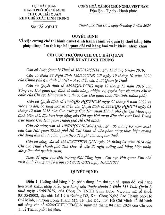 Công Ty TNHH Sinh Dược Vicohn, mã số thuế 0313548002, địa chỉ tại Lô 1-9-6 Đường D2, Khu công nghệ cao Tp.HCM, phường Long Thạnh Mỹ, Tp.Thủ Đức, Tp.HCM để thi hành nội công văn số 4224/CCTTPTĐ-QLN ngày 23/04/2024 của Chi cục Thuế Tp. Thủ Đức, với số tiền bị cưỡng chế là hơn 5,8 tỷ đồng.