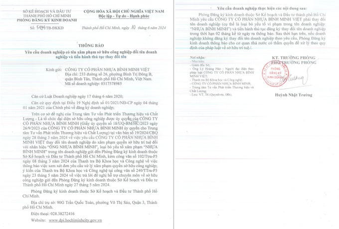 Văn bản của Phòng Đăng ký kinh doanh Sở Kế hoạch Đầu tư Tp. HCM yêu cầu Công ty Cổ phần Nhựa Bình Minh Việt phải đổi tên doanh nghiệp do có tên xâm phạm sở hữu công nghiệp.