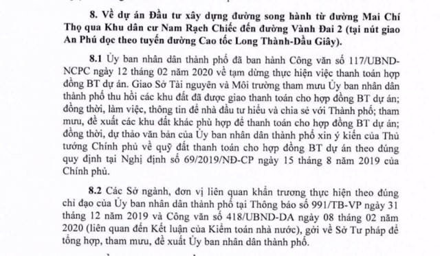Ngày 25/9, UBND TP.HCM đã có thông báo thu hồi khu đất 14,8 ha tại phường An Phú, quận 2 đã giao cho Công ty Nguyên Phương. Trước đó, ngày 12/2/2020, UBND TP.HCM có công văn số 117/UBND-NCPC về việc tạm dừng thực hiện thanh toán hợp đồng BT này.