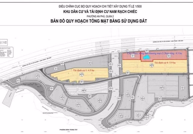 Theo quy hoạch chi tiết tỷ lệ 1/500 do UBND quận 2 phê duyệt vào tháng 7/2017, khu đất thứ nhất có diện tích hơn 4,5ha, trong đó diện tích đất ở chiếm hơn 2,63ha, còn lại là đất dành làm công trình hạ tầng công cộng kèm theo. Khu đất thứ 2 có diện tích hơn 10ha, trong đó diện tích đất ở lên đến hơn 5ha, cộng với phần đất thương mại, dịch vụ, văn phòng khách sạn rộng hơn 1,2ha; phần còn lại dành làm hạ tầng công cộng.