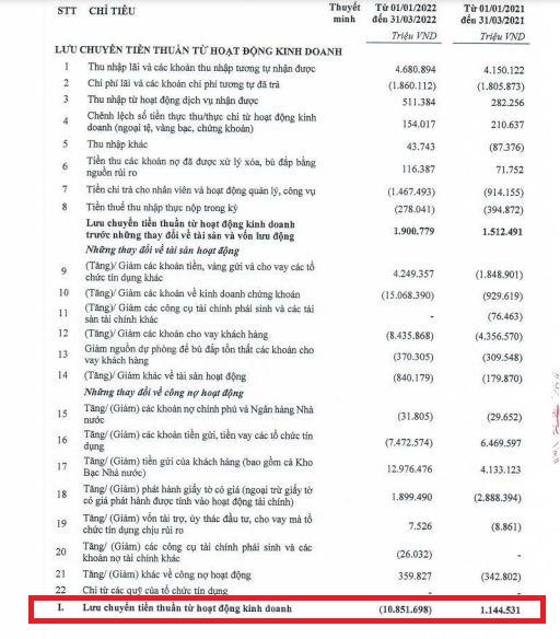 Cụ thể, tổng lưu chuyển tiền thuần trong kỳ tại nhà băng này âm tới hơn 11.012 tỷ đồng, trong khi cùng kỳ năm 2019 dương hơn 954 tỷ đồng. Bao gồm, lưu chuyển tiền thuần từ hoạt động kinh doanh bị âm hơn 10.851 tỷ đồng (cùng kỳ 2021 dương hơn 1.144 tỷ đồng); lưu chuyển tiền thuần từ hoạt động đầu tư hơn 76 tỷ đồng và lưu chuyển tiền thuần từ hoạt động tài chính hơn 84 tỷ đồng.