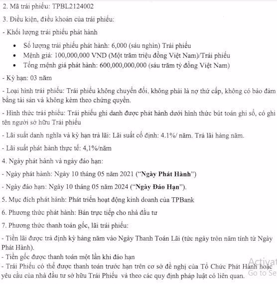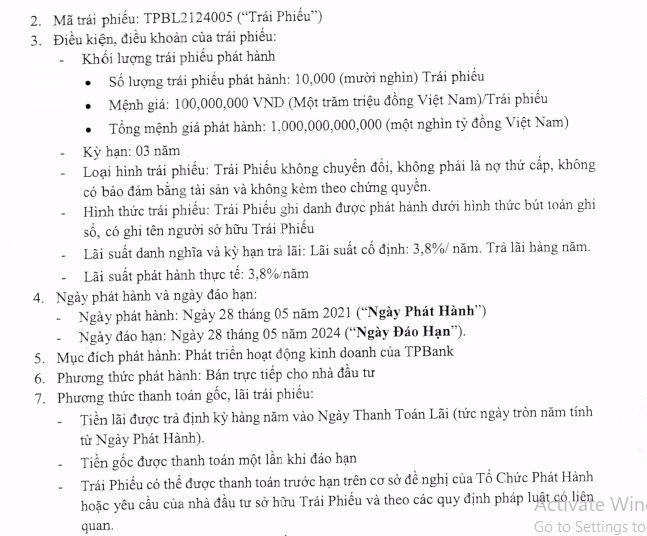 Cũng trong tháng 5, TPBank thông báo đã phát hành 600 tỷ đồng trái phiếu kỳ hạn ba năm, trả lãi hàng năm theo lãi suất cố định 4,1%/năm. Ngày phát hành là 10/5/2021 và ngày đáo hạn là 10/5/2024. Trái phiếu được bán trực tiếp cho nhà đầu tư là một công ty chứng khoán trong nước.
