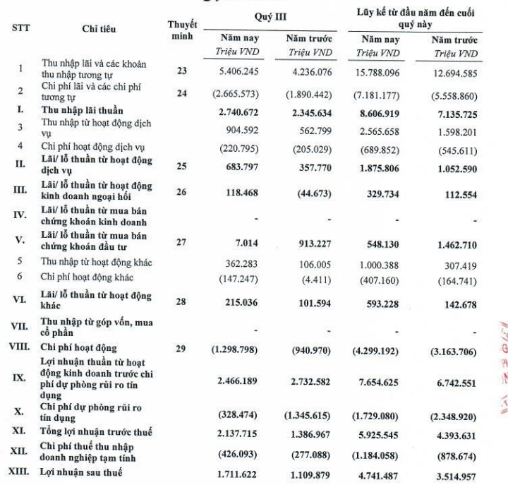 Đáng chú ý, lãi từ hoạt động khác đạt hơn 593,2 tỷ đồng cao gấp 4,2 lần so với cùng kỳ nhờ thu từ các khoản nợ đã được xử lý xóa, bù đắp bằng nguồn rủi ro hơn 503 tỷ đồng.