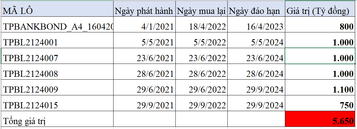 Đến tháng 6/2022, nhà băng này cũng mua lại trước hạn toàn bộ 3 lô trái phiếu gồm các mã TPBL2124007 phát hành ngày 23/6/2021, ngày đáo hạn 23/6/2024 có giá trị 1.000 tỷ đồng; mã TPBL2124009 phát hành ngày 29/6/2021 có giá trị 1.100 tỷ đồng và mã TPBL2124008 phát hành ngày 28/6/2021 và đáo hạn ngày 28/6/2024 với giá trị 1.000 tỷ đồng.