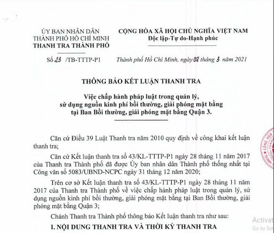 Thanh tra TP.HCM vừa thông báo kết luận về chấp hành pháp luật trong quản lý, sử dụng nguồn kinh phí bồi thường, giải phóng mặt bằng tại Ban Bồi thường, giải phóng mặt bằng quận 3 (Ban bồi thường). Thời kỳ thanh tra trong 2 năm 2015, 2016 và 7 tháng năm 2017, từ ngày 1/1/2015 đến ngày 31/7/2017.