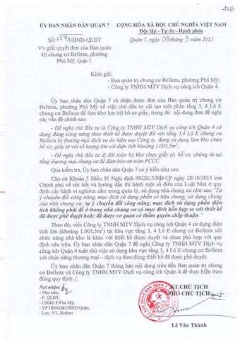 Vì vậy, UBND quận 7 đề nghị Công ty TNHH MTV Dịch vụ công ích quận 4 tuân thủ việc sử dụng tầng 3, 4 lô E chung cư Belleza với chức năng thương mại – dịch vụ theo đúng thiết kế đã được duyệt.