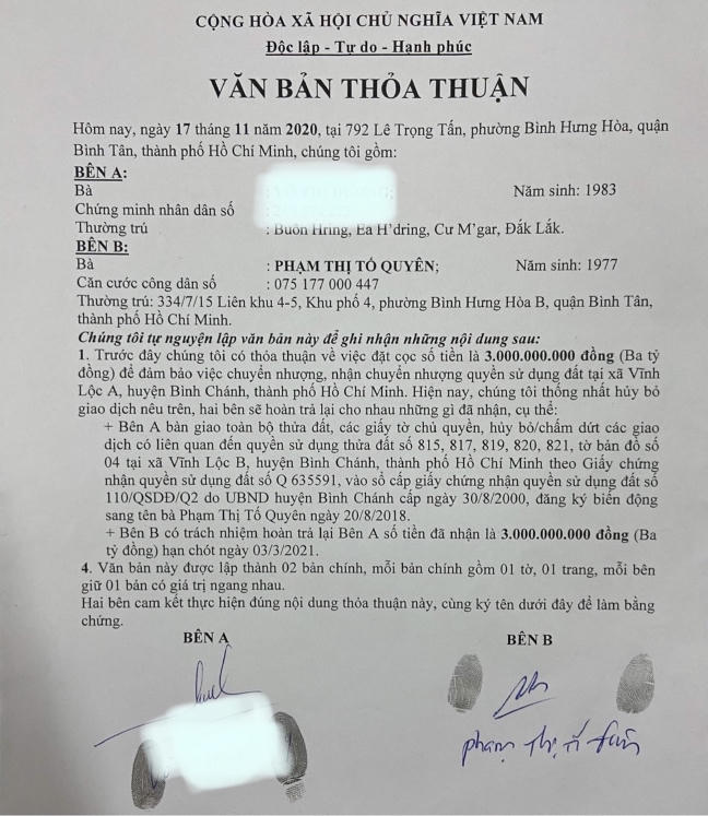 Ngày 17/11/2020, hai bên đã ký kết văn bản thỏa thuận thống nhất về việc hủy giao dịch mua bán đất. Theo đó, bà Thủy có trách nhiệm trả lại giấy tờ có liên quan đến thửa đất. Đồng thời, bà Quyên có trách nhiệm hoàn trả lại số tiền đặt cọc 3 tỷ đồng, hạn chót đến ngày 03/3/2021 phải hoàn trả số tiền trên.