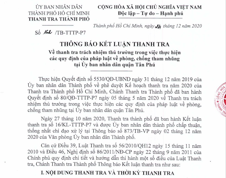 Thanh tra TP.HCM vừa có kết luận thanh tra trách nhiệm thủ trưởng trong việc thực hiện các quy định của pháp luật về phòng, chống tham nhũng tại UBND quận Tân Phú giai đoạn 2018–2019 và chỉ ra quận này có hàng loạt thiếu sót.