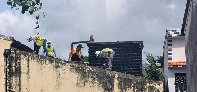 Công nhân chuẩn bị tháo mái để xử lý hệ thống khí gas phía trong nhà máy.