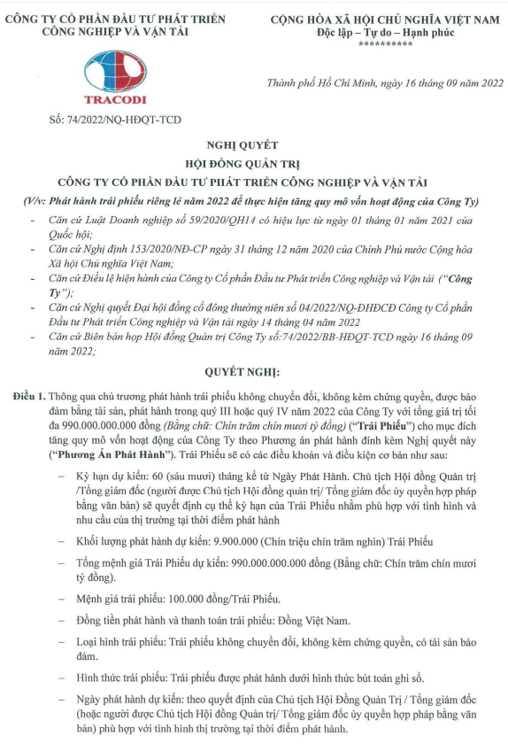 HĐQT CTCP Đầu tư phát triển Công nghiệp và Vận tải (Tracodi, HOSE: TCD) vừa ra nghị quyết phát hành trái phiếu riêng lẻ để tăng quy mô vốn hoạt động của công ty.
